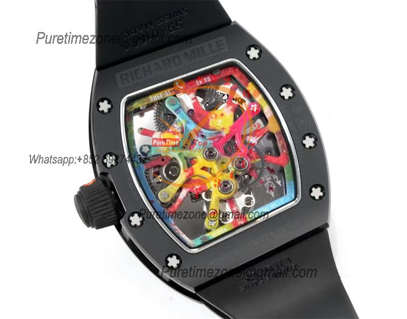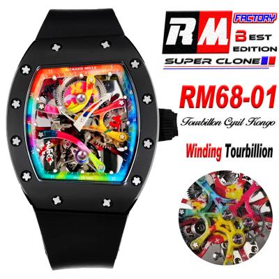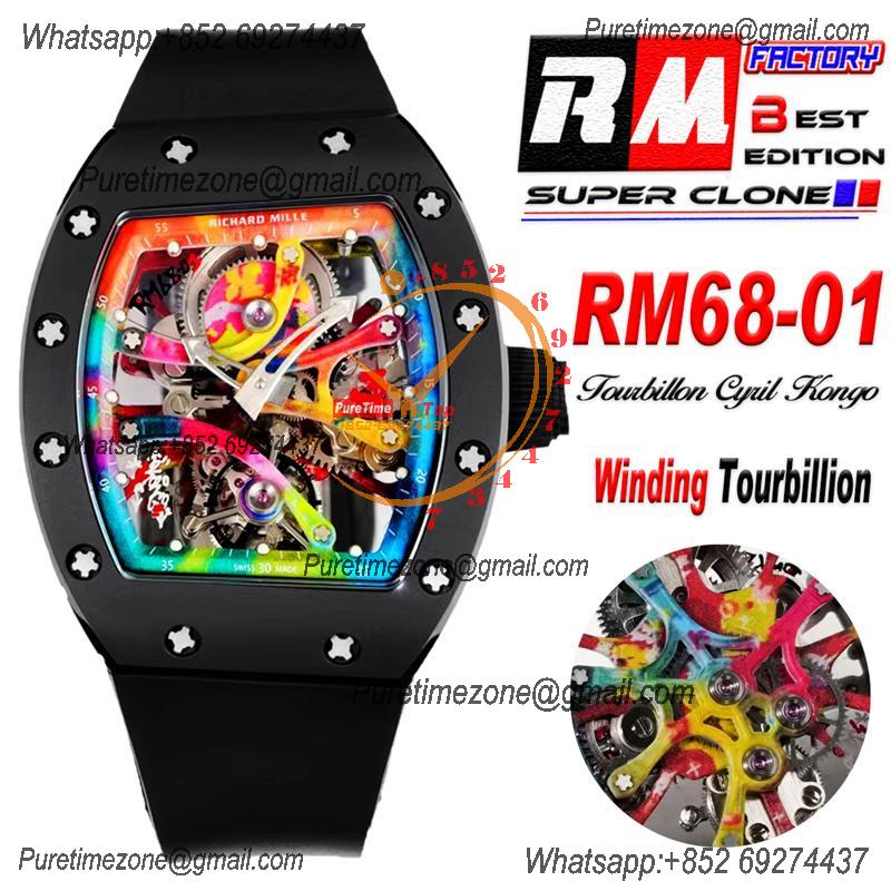 RM68-01 Cyril Kongo Real Tourbillon Manual Winding Mens Watch Best Edition RMF Black Ceramic Skeleton Dial Black Rubber