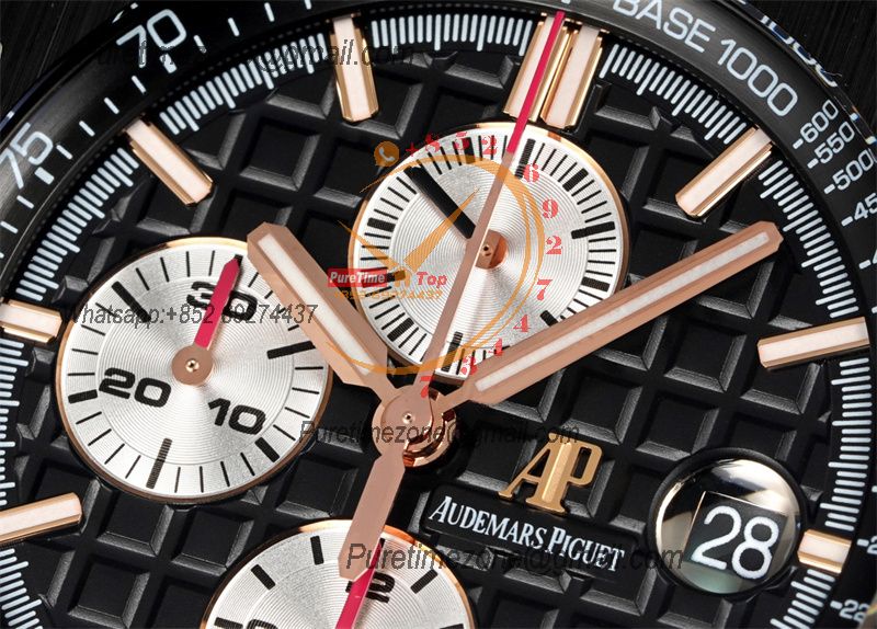 Movement:Base Movement: Asian 7750 automatic chronograph movement at 28800vph; Decoration: Platinum plated movement plate and rotor which are made according to the genuine movement, the best looking AP Calibre 3126 Movement Clone at the moment.