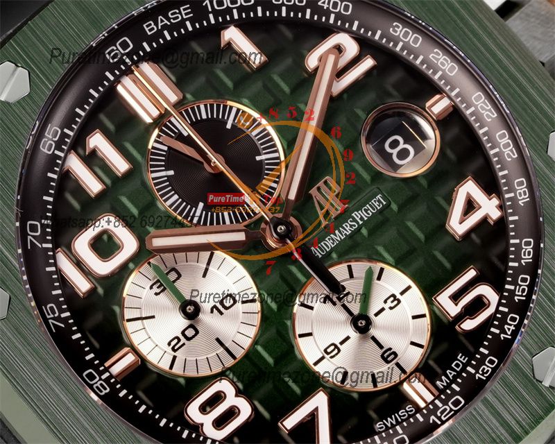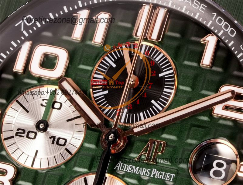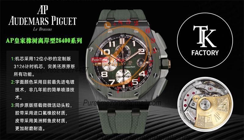 Movement:Base Movement: Asian 7750 automatic chronograph movement at 28800vph; Decoration: Platinum plated movement plate and rotor which are made according to the genuine movement, the best looking AP Calibre 3126 Movement Clone at the moment.
