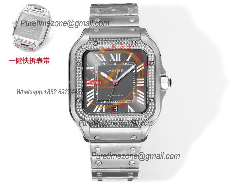 Santos WSSA0037 Large Model 39.8 M9015 Auto Mens Watch THBF Diamond Bezel Gray Dial SmartLink SS Bracelet