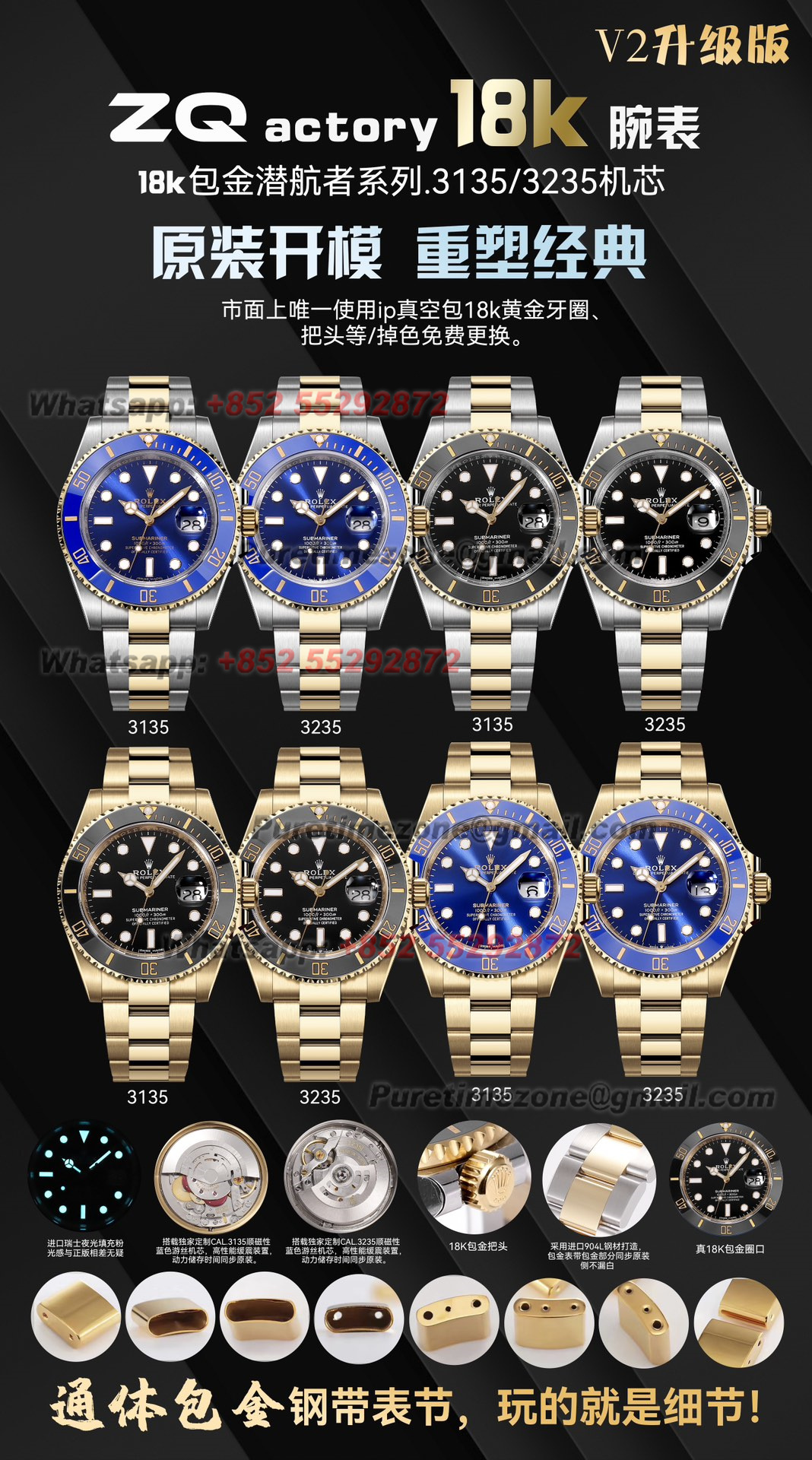 Case:18k yellow gold wrapped solid 904L stainless steel case