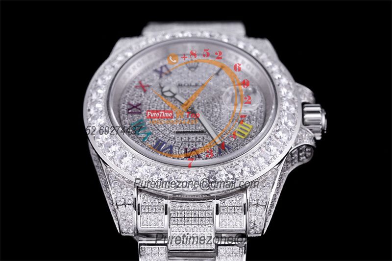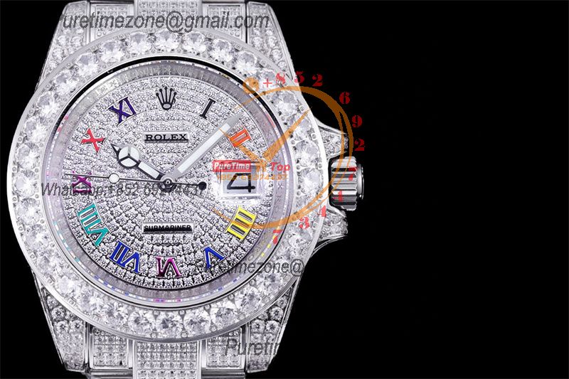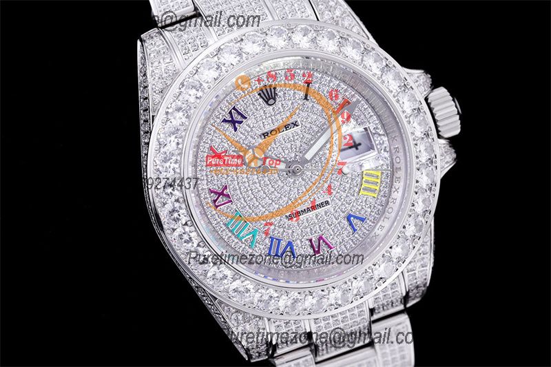 Home Rolex Iced Out Submariner A21J Automatic Mens Watch Best Edition ZYF Paved Diaomond Color Roman Dial Fully Ice Out 904L Steel Bracelet
