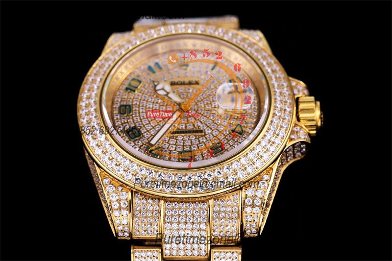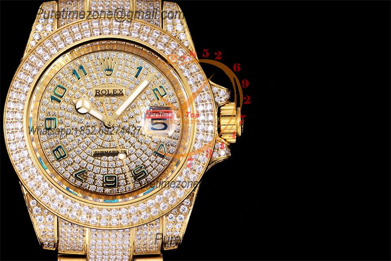 Home Rolex Iced Out Submariner A21J Automatic Mens Watch Best Edition ZYF YG Paved Diaomond Green Number Dial Ice Out 904L Steel Bracelet