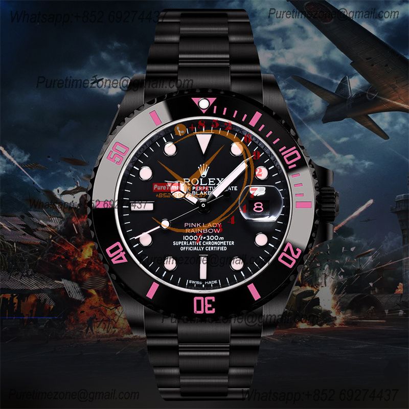 Submariner BLAKEN A3135 Automatic Mens Watch Best Edition BLAKENF 40 PVD Steel All Black Pink Dial Oyster SS Bracelet