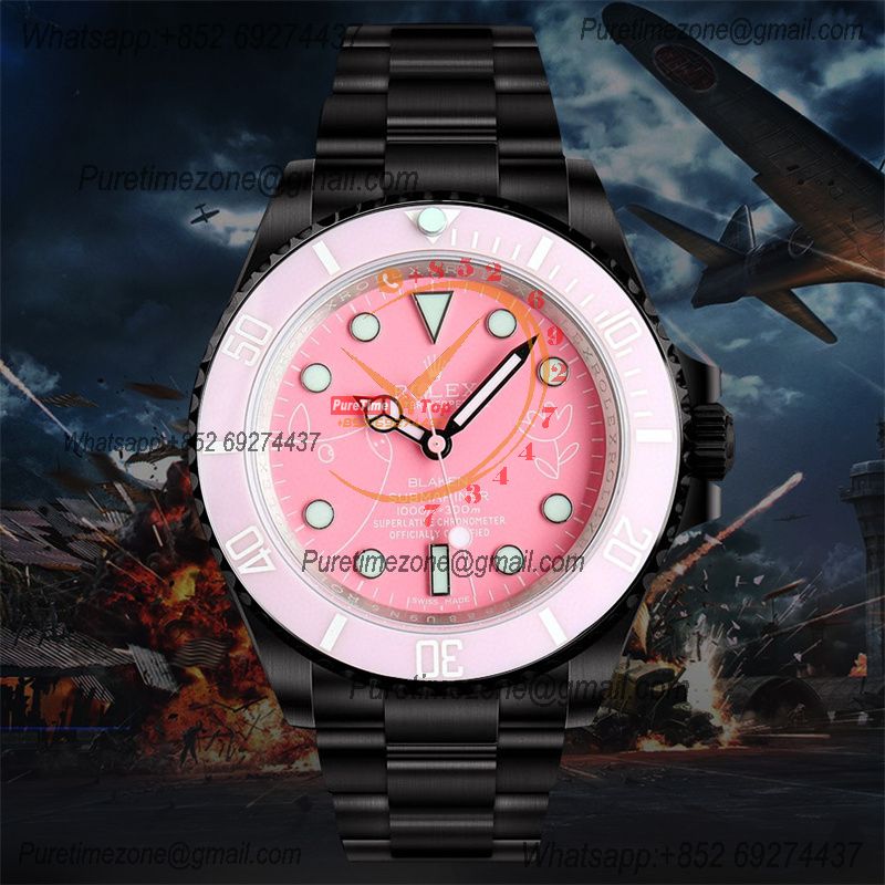 Submariner BLAKEN A3135 Automatic Mens Watch Best Edition BLAKENF 40 PVD Steel All Black Pink Dial Oyster SS Bracelet
